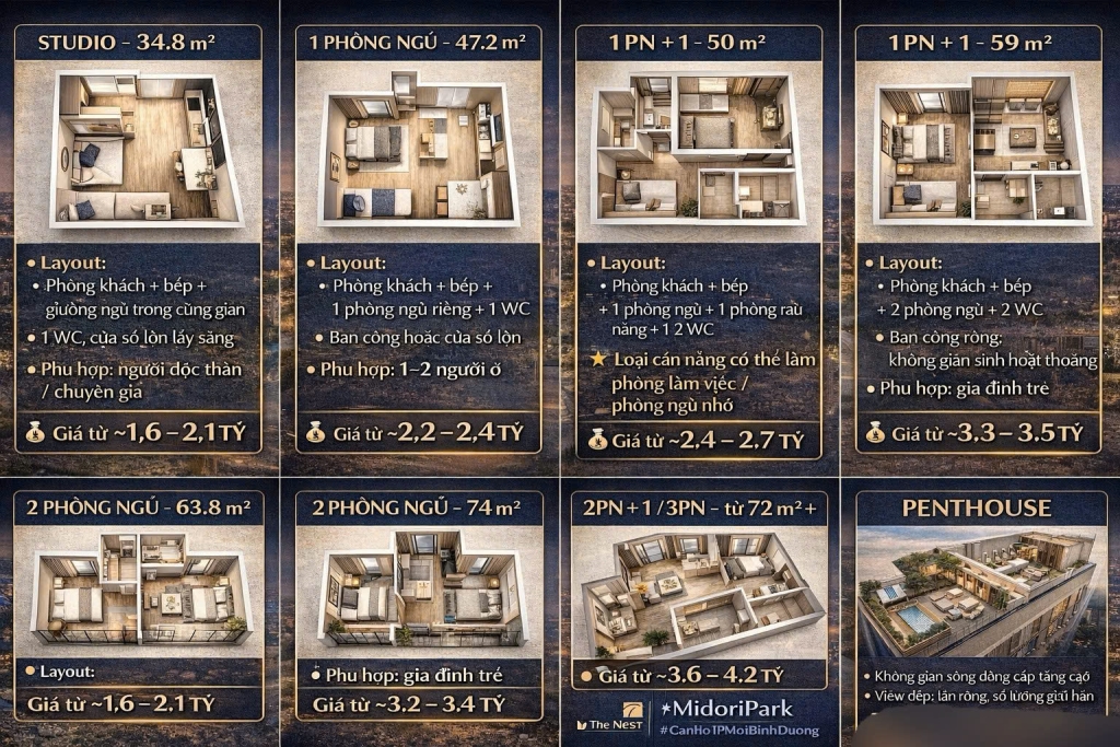 Sở hữu ngay căn hộ Studio 38m2 với 1 phòng ngủ, 1 phòng vệ sinh tại dự án The NEST, Midori Park, Thành phố mới Bình Dương với mức giá hấp dẫn chỉ 1.61 tỷ. Đây là cơ hội đầu tư hoặc an cư lý tưởng tại trung tâm hành chính tương lai của tỉnh Bình Dương.